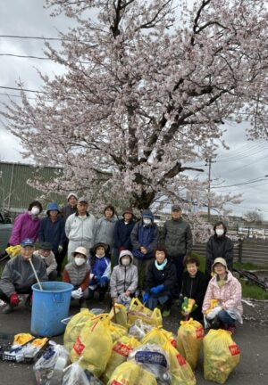 風が強く桜吹雪の舞う寒い朝でしたが、例年通り今年も国道、市道のゴミ拾いを致しました。